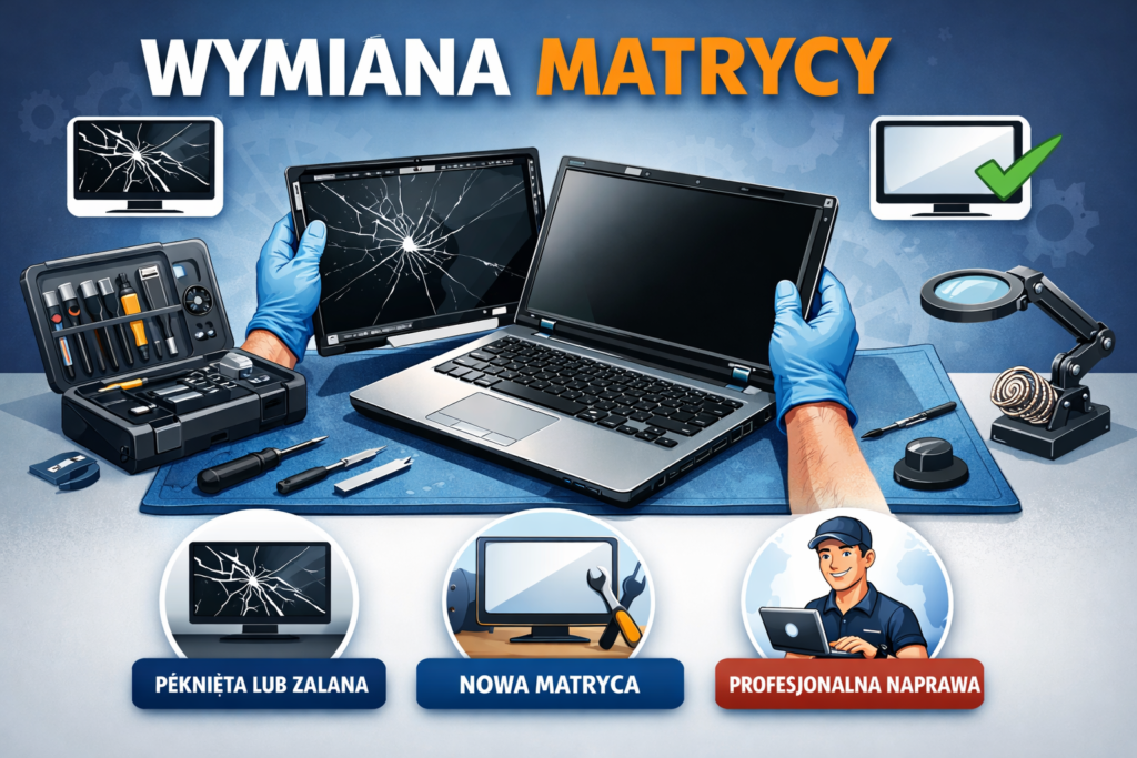 Laptop ma pęknięty ekran, paski lub kolorowe plamy? Profesjonalna wymiana matrycy laptopa przywraca czytelny obraz i komfort pracy. Działamy lokalnie: Wawer, Anin, Józefów, Otwock. Zobacz obszar działania lub sprawdź cennik. Zadzwoń: 697 302 008 Umów wizytę Dlaczego sprawna matryca jest kluczowa? Matryca to „okno” laptopa – odpowiada za ostrość, kolory i komfort pracy. Pęknięcia, wycieki ciekłych kryształów, […]